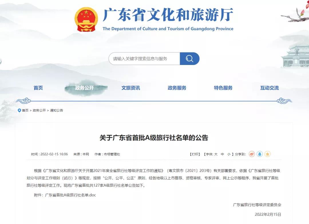 2月15日广东省文化和旅游厅发布《关于广东省首批A级旅行社名单的公告》,华侨城旅行社通过严格的等级评定程序,获评广东省首批4A级旅行社!