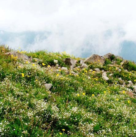7月的小五台山果然是最为烂漫的季节:云朵在天上自由地移动,而小五台山简直变成了白云身下的空中花园,各种叫不出名字的花肆意地开着,灿烂的金莲迎风绽放;溪水里有各色的叶子,高山上的黄草摇曳的,让人舒服得想睡。听当地人说,由于小五台山海拔高、地形复杂,使得这里植物种类繁多,以菊科、禾本科、蔷薇科、豆科植物最多。国家重点保护的植物胡桃楸、野大豆、膜荚黄芪等这里都有,我国特有的虎榛子、蚂蚱腿子和文冠果、臭松等也有少量分布。怪不得,只觉得这里的花多草多,却叫不出名字呢!