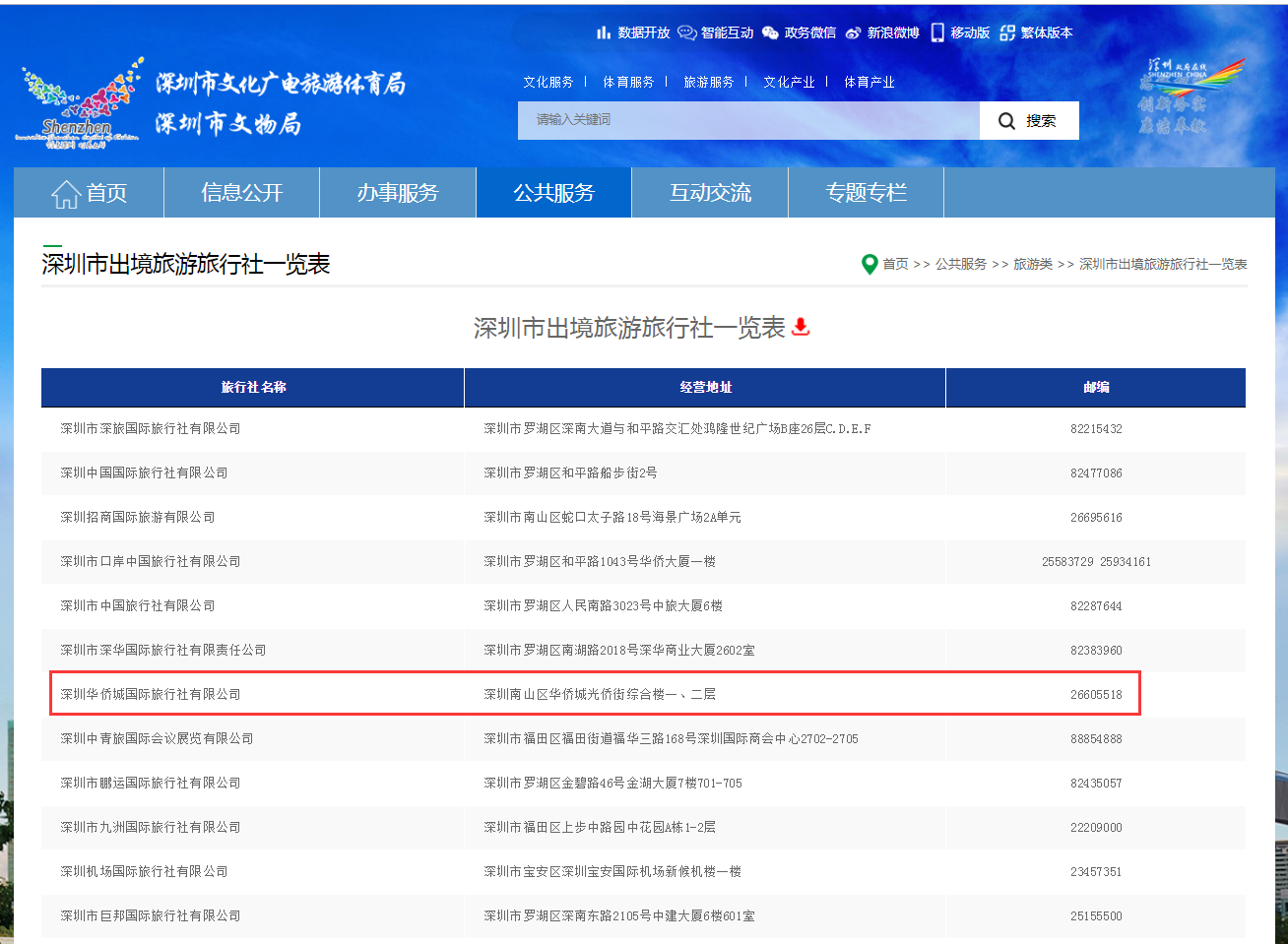 3、打开“旅行社一览表”网页后,第1页上方,您就能找到我们:深圳华侨城国际旅行社有限公司